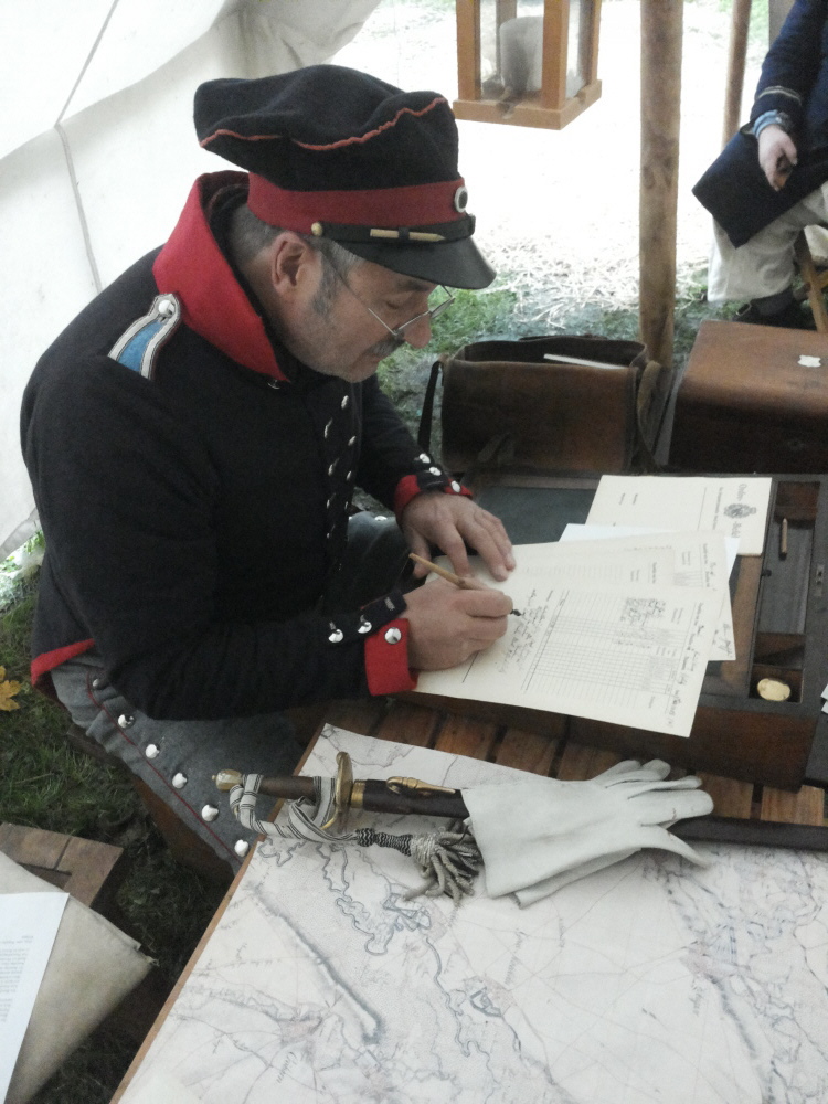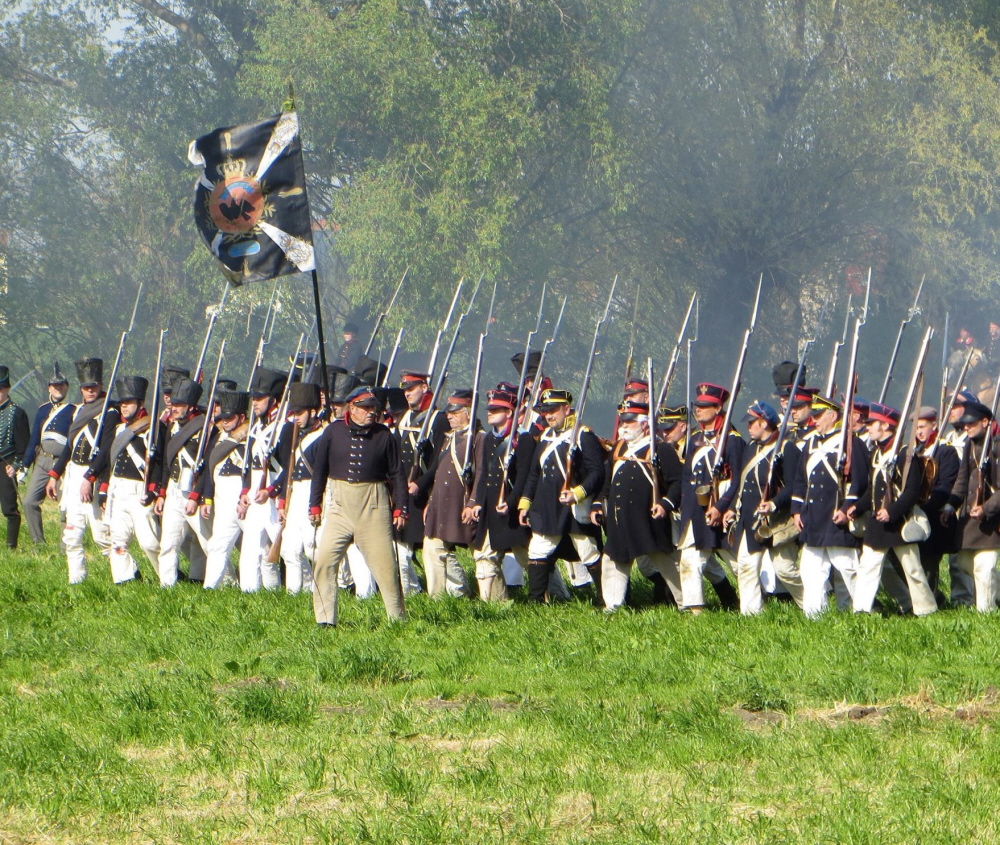 | Das 4te Bataillon des 3ten Kurmärkischen Landwehr Infanterie Regiments Als Darstellungsform unserer Infanteriegruppe des 4ten Bataillons im 3ten Kurmärkischen Landwehr Infanterie Regiments haben wir die einer Marscheinheit im Felde gewählt. Das heißt, auf den teilweise monatelangen Feldzügen hatten die Soldaten selten Möglichkeiten ihre Kleidung und Ausrüstungsgegenstände, die durch Wind und Wetter verschlissen, nach Vorschrift zu ersetzen. Im Gegensatz zu Garnisonstruppen, die aus den Depots und Magazinen schöpfen konnten, mussten sich die Einheiten im Felde an Beutestücke oder an das halten, was während des Marsches zu bekommen war. | |||
